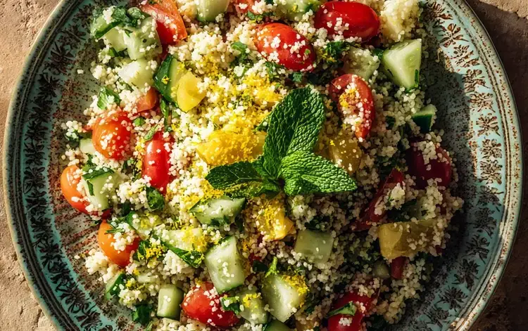 Taboulé tomates + concombre + semoule (classique et frais) → 300 g tomates + 240 g concombre + 100 g oignon + 200 g semoule + 110 g pois chiches
